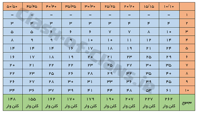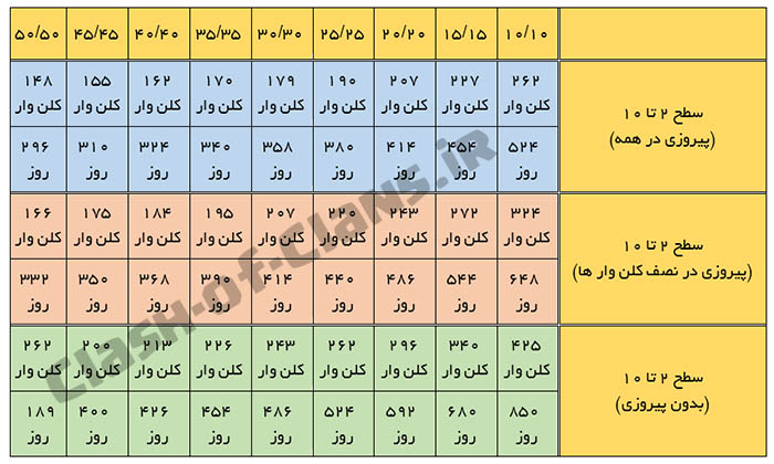 واقعیت این هست که قدرت کلن تاثیر چندانی ندارد ولی می توان گفت که تعداد اعضای کلن روی این مدت زمان بسیار موثر است. در جداول زیر تعداد کلن وار و مدت زمان رسیدن به سطح های مختلف کلن را مشاهده می کنید