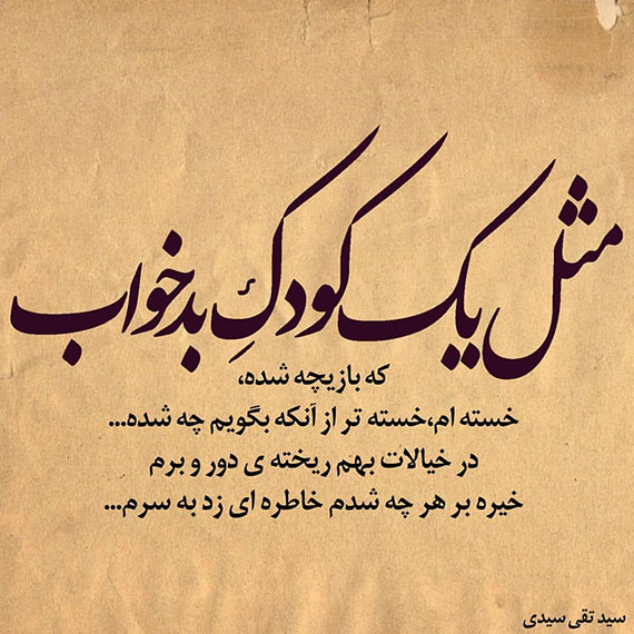 خسته شدم از این همه شب ، از این همه روز ، ازاین همه هی " درست میشه ، نترس " گفتن به خودم که بدونم دروغه و دیگه هیچی هیچ وقت درست نمیشه