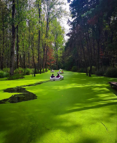 نیمکت های چوبی سبز رنگ یک کافه