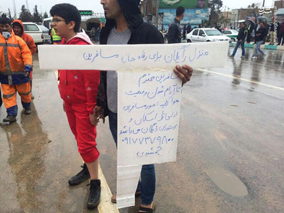 چهار . مردم روی پلاکادر و تابلو در دست آدرس و شماره تلفن برای منزل مجانی نوشتند و توی باران ساعتها ایستادند