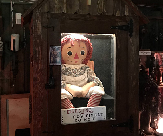 عروسک آنابل حالا در موزه اِد و لورن وارِن داخل یک جعبه شیشهای با هشدار