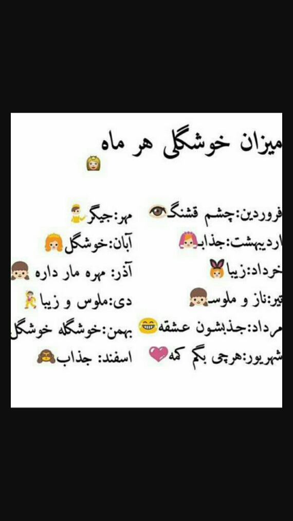 فروردین: لوس و یه دنده ولی به وقتش مهربون اردیبهشت: فوضول، مهربون، ازحق خود دفاع کن خرداد: یکم مهربون، خوش تیپ، خوش اخلاق ♥ * ♥ * ♥ * ♥ * ♥ * ♥ تیر: بدسلیقه، غرغرو، ولی یه کم مهربون مرداد: خوش تیپ، مغرور، عصبی، یکمم مهربون به وقتش شهریور: مغرور، خوش تیپ، خوش سلیقه، همیشه مهربون، سرو وضعش همیشه تمیز، عاقل . ♥ * ♥ * ♥ * ♥ * ♥ * ♥ مهر: مهربون، غرغرو، سرووضعش تمیز، جسور آبان: به فکر شکمشه همش، عاقل، عصبی آذر: بداخلاق، عصبی، خنده هاش زورکی، مهربون بعضی اوقات ♥ * ♥ * ♥ * ♥ * ♥ * ♥ دی: مهربون، جذاب، خوش تیپ، خوش سلیقه، دست بزن داره بهمن: مهربون، رودار، پرو، جسور، عاقل اسفند: بی خیال، همیشه خندان، مهربان، جذاب، همیشه توخواب ورویای ♪ ♫ ♪ ♫ ♪ ♫ ♪ ♪ ♫ ♪ ♫ ♪ من شهریوری ام شماهم بگین چی هستین