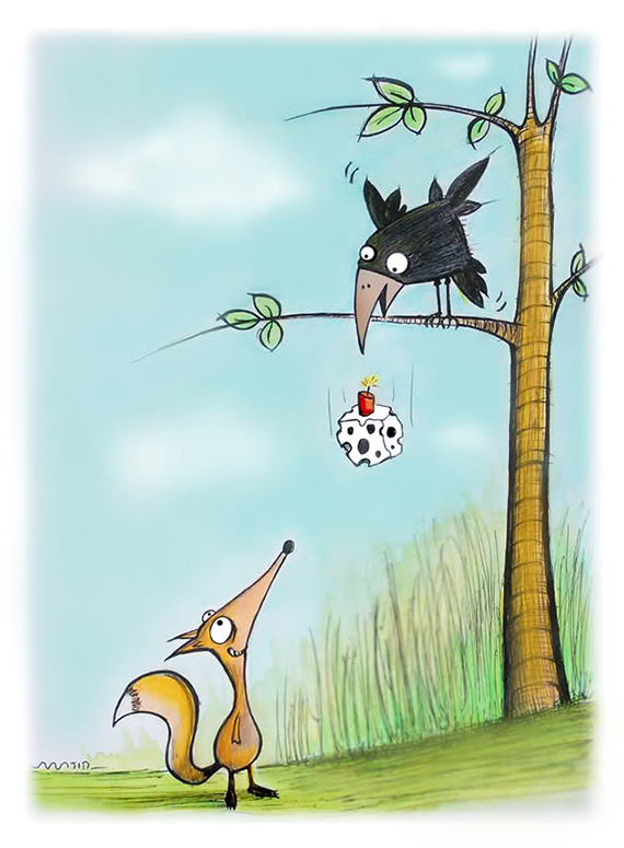 روباه گفت خیلی خوب و تا آمدبسم الله بگوید کلاغ از دهنش افتاد وپرید سر دیوار و اهل ده را خبر کرد آمدند روباه را کشتند