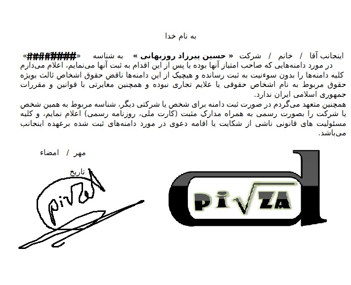 سلام، با تشکر از ارسال مدارک برای ثبت این دامنه، لطفا تعهدنامه را با امضای :shock: دستی :shock: و ذکر نام و تاریخ به صورت :shock: دستی :shock: ، مجددا ارسال نمایید. مرکز ثبت دامنه